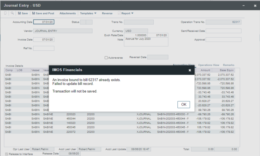 To resolve this error from the Voyage view, navigate to the Journal Entry Module under Financials, search for the corresponding vessel/voyage, and Save/Post the entry.