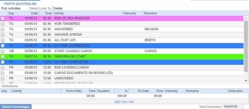 The Laytime Calculator preserves all manually entered activity and deduction percentages, which appear in blue text, unless you reset them.
