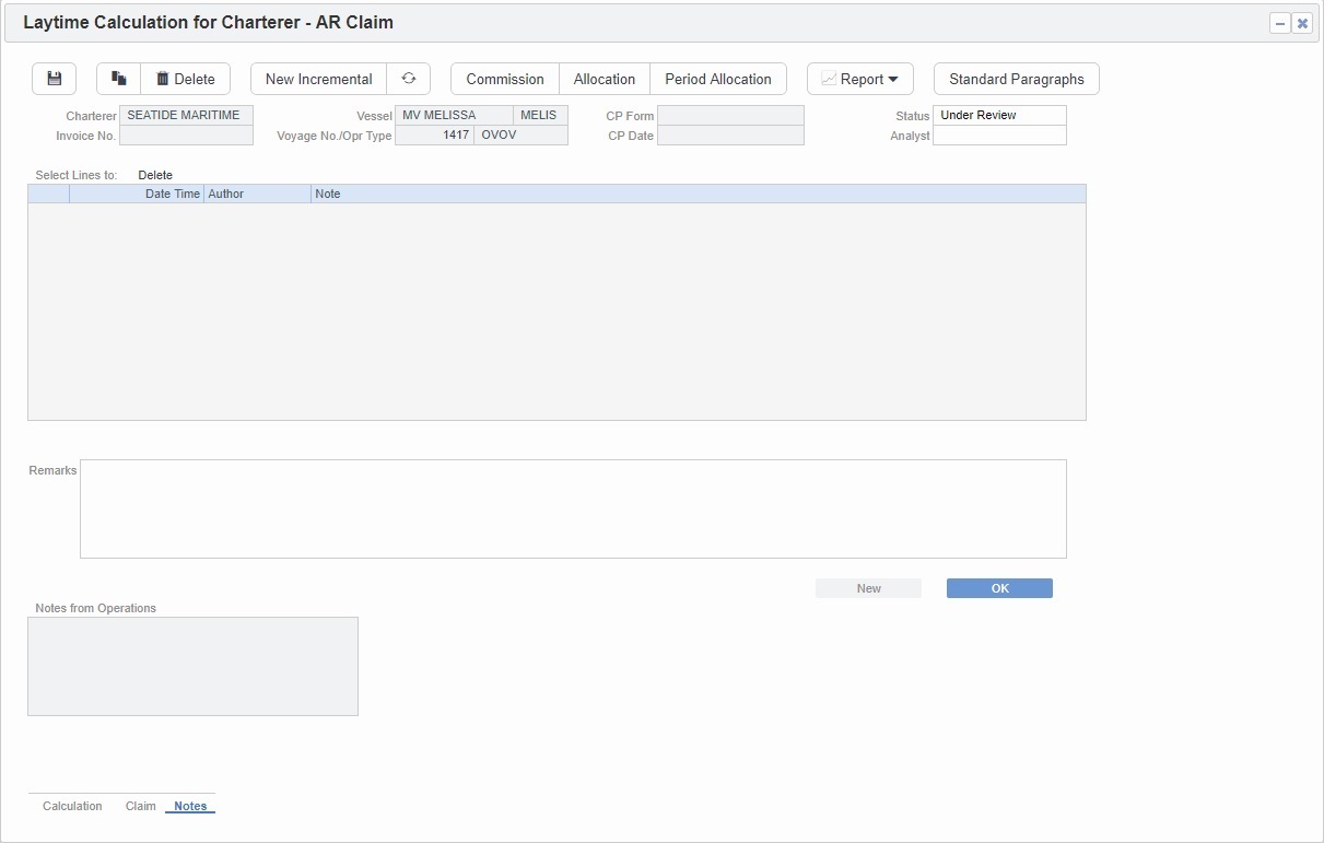On the Notes tab, you can enter notes related to the Laytime Calculation. Notes can be added, edited, or deleted even after the invoice is approved/posted. You can also view Notes from Operations.