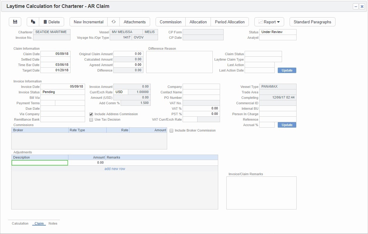 On the Incremental tab, you can manage Incremental Demurrage Claims, for adjustments representing the result of negotiations after posting/sending an initial invoice. Because a previous Claim cannot be edited, the Claim must have an Invoice Number and a Status of Actual.