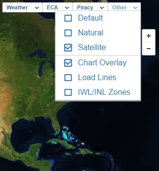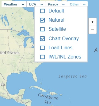 To view nautical charts on the map when zoomed in, hover over Other and then select Chart Overlay.