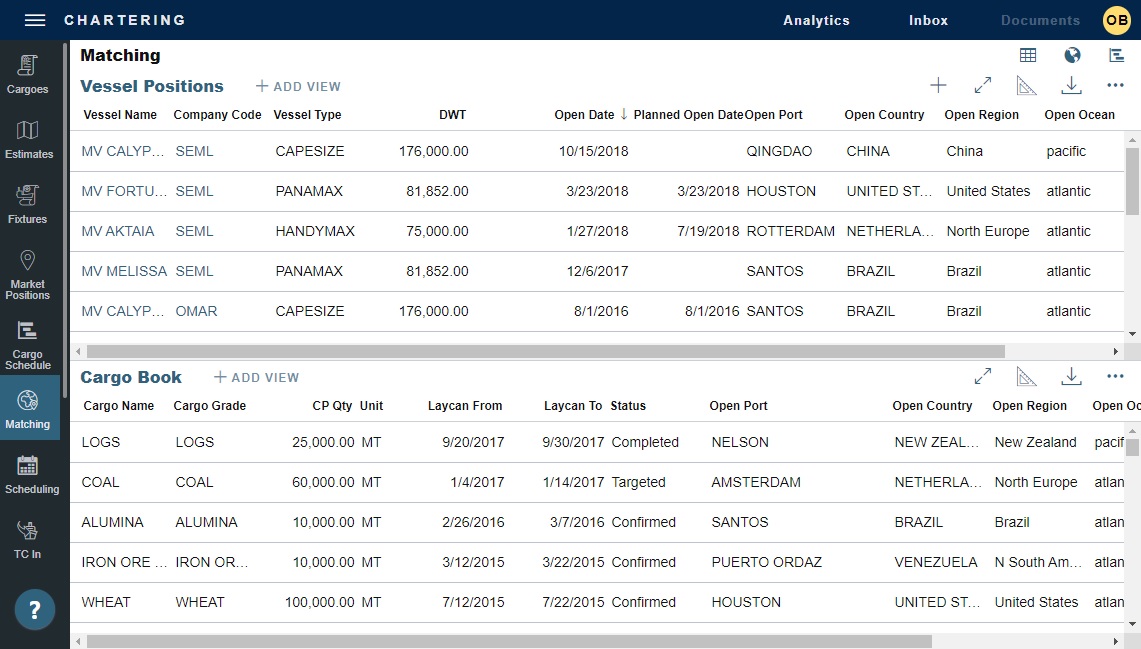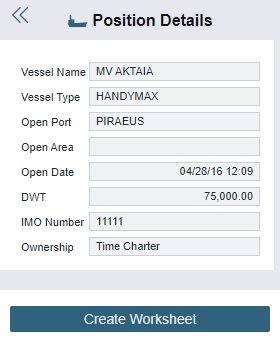 Matching enables you to view vessel and cargo positions in one location; it consists of a Vessel Positions list and a Cargo Book list. Owned positions are added from TC In, TC Out, and Cargo contracts. When you find a good position to work with, you can create or open a Worksheet in Estimates.