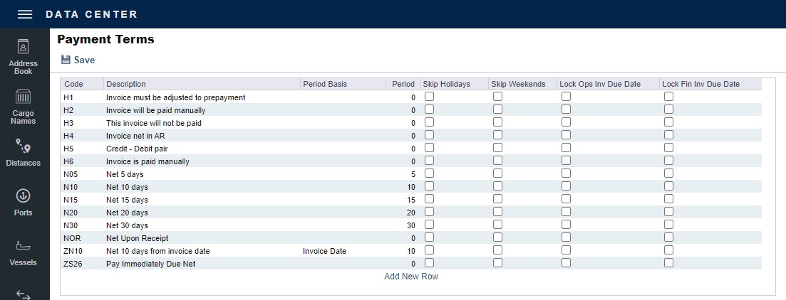 Note: A default set of terms is provided, but you can add and remove terms as required. You must have the Payment Terms Module Right selected, under Charter Party Terms in the Data Center.