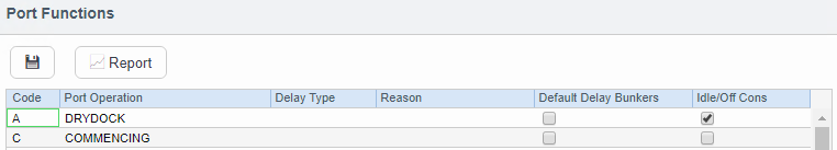 Entering Delay Type and Delay Reason values in the Delay Type and Reason columns links the Port Function with a Delay. When that Port Function is used in an Estimate or a voyage, and the Port Days value is not zero, a Delay is created with the linked port dates and time zone; it can only be edited in the Voyage Manager Itinerary.