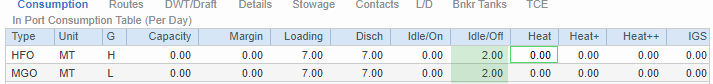 Idle/Off Cons (for new or unused Port Functions that are not L, D, or M only): Select to calculate In Port Consumption based on Idle/Off Rate (from Vessel Details) and Total Voyage Port Days.