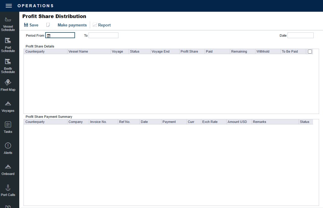 You can use the Profit Share Distribution form to distribute voyage profit to a third party.