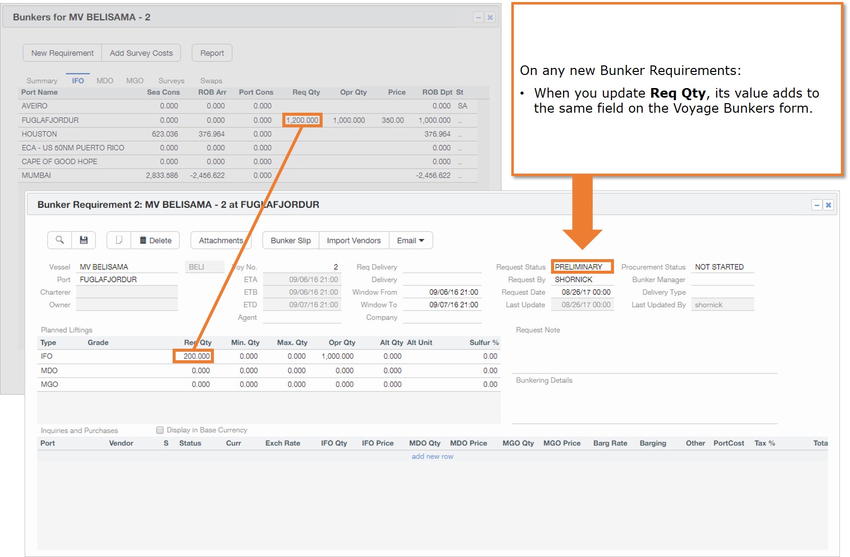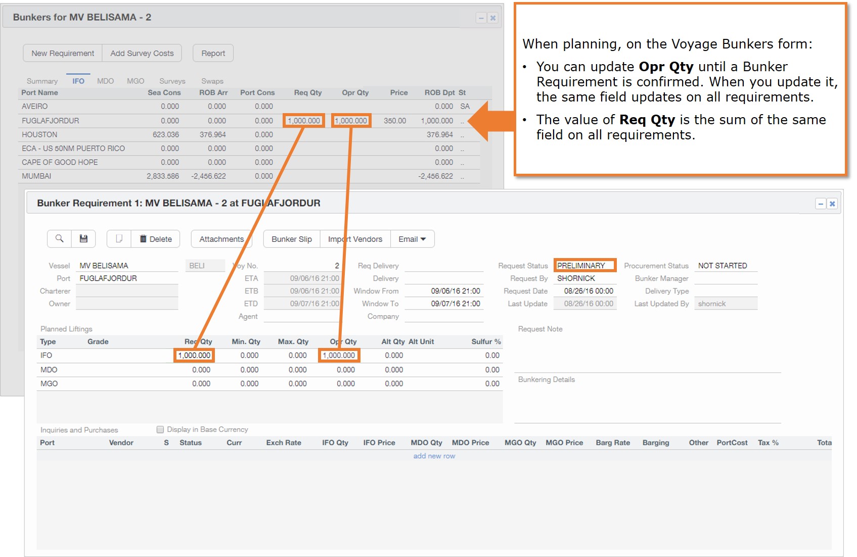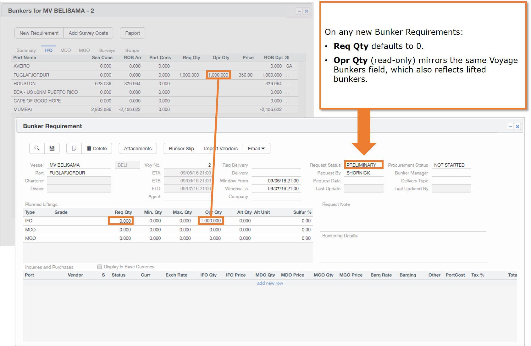 When you create the first preliminary requirement, Req Qty and Opr Qty (read-only) in the requirement default to 1,000 MT (the value of Opr Qty on the Voyage Bunkers form). Req Qty on the Voyage Bunkers and Bunker Requirement forms are kept in sync; you can update the value in one of these fields, and it updates the other field as well.