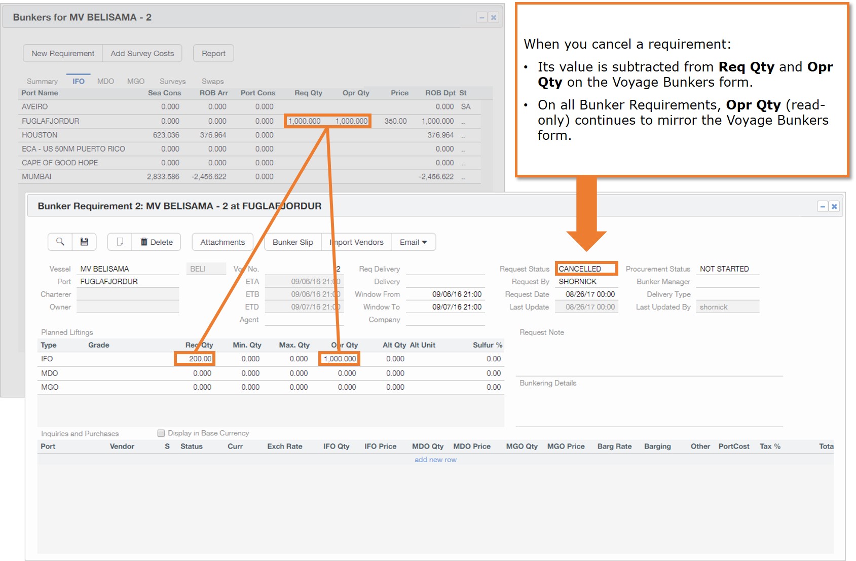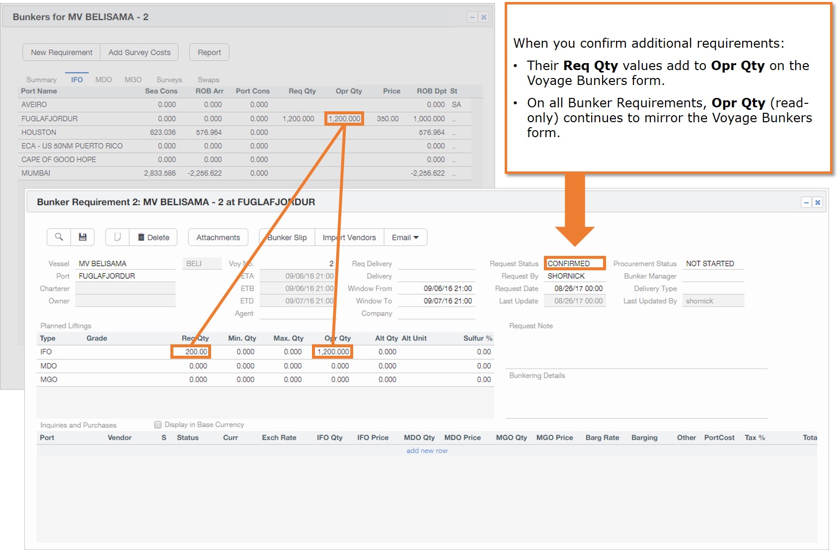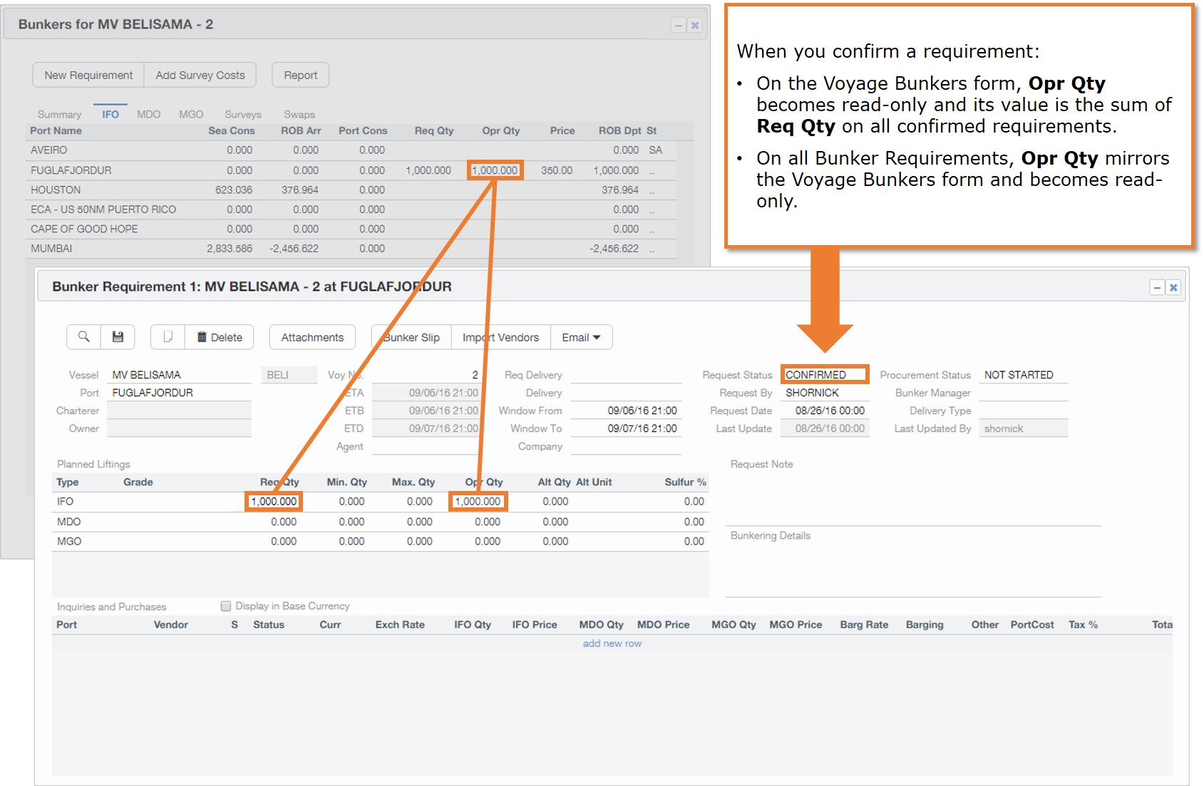 If you create, edit, or delete a confirmed requirement, Opr Qty recalculates on the Voyage Bunkers form.