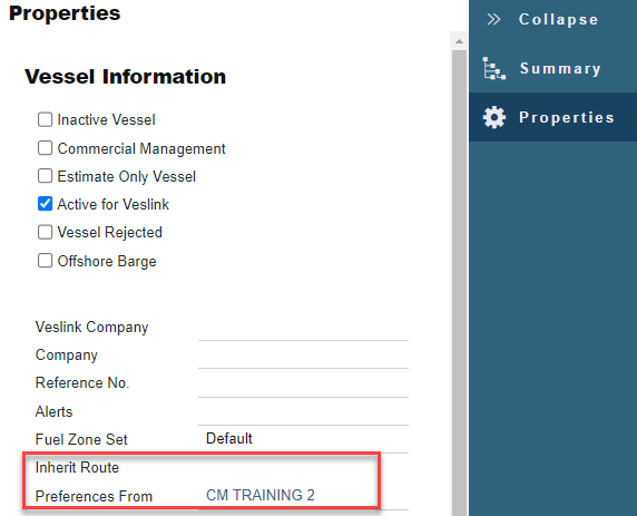 Once the routing preferences are set up for a Benchmark Vessel, any other vessel can inherit them using Inherit Route Preferences From field in Vessel Properties.