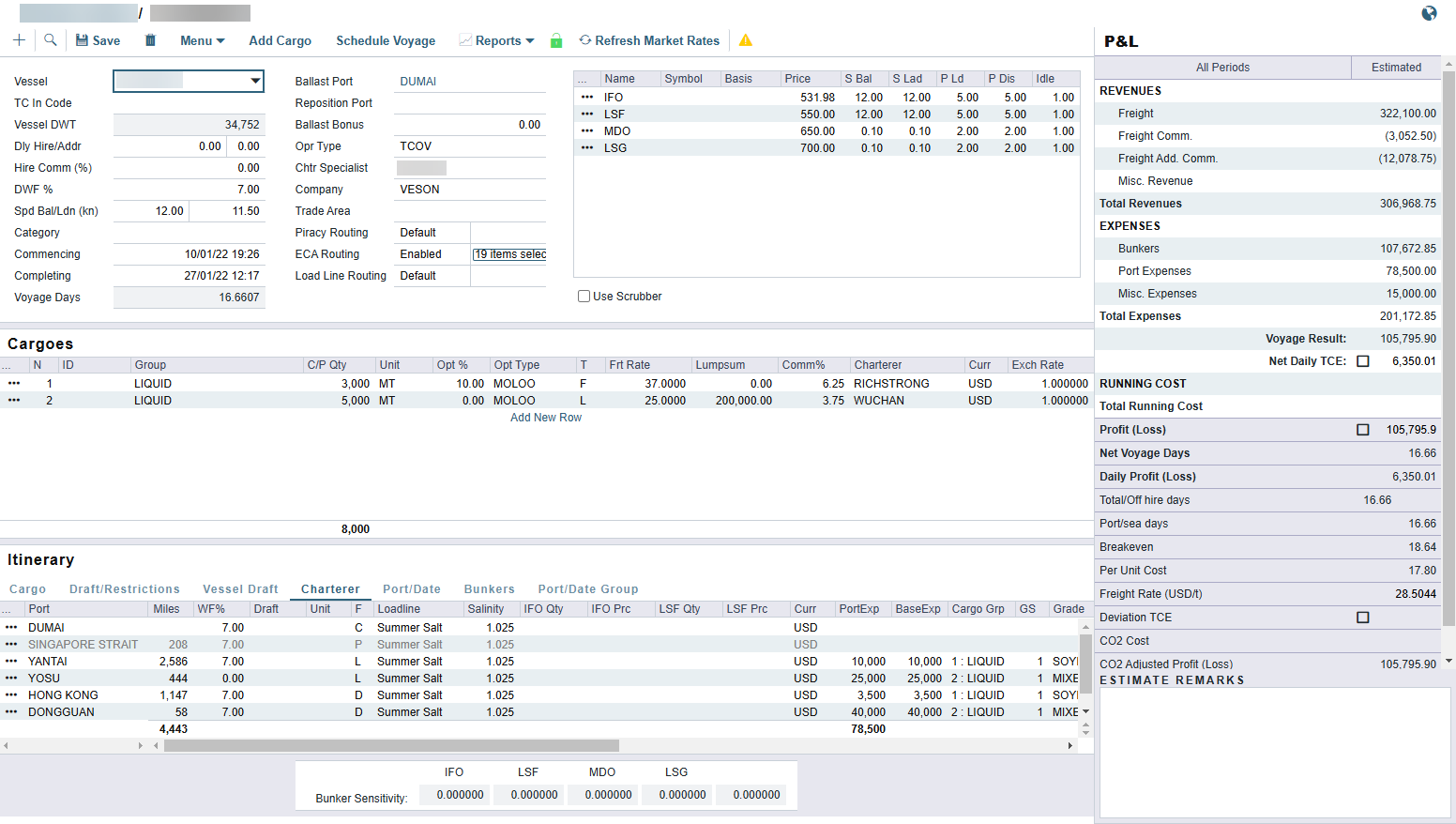 You can determine what to charge a Charterer for the use of your vessel by creating a Time Charter Out (TC Out) Estimate. You can try various Rates to estimate your Profit and Loss. Unlike the Voyage Estimate, bunkers are not included, and the primary concerns are the Brokers and the Itinerary information. From the TC Out Estimate, you can create a TC Out.