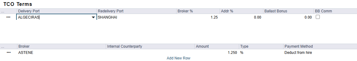 In the TCO Terms grid, you can specify Delivery/Redelivery ports, Broker/Address total commissions, Ballast Bonus, and whether the Ballast Bonus is commissionable.
