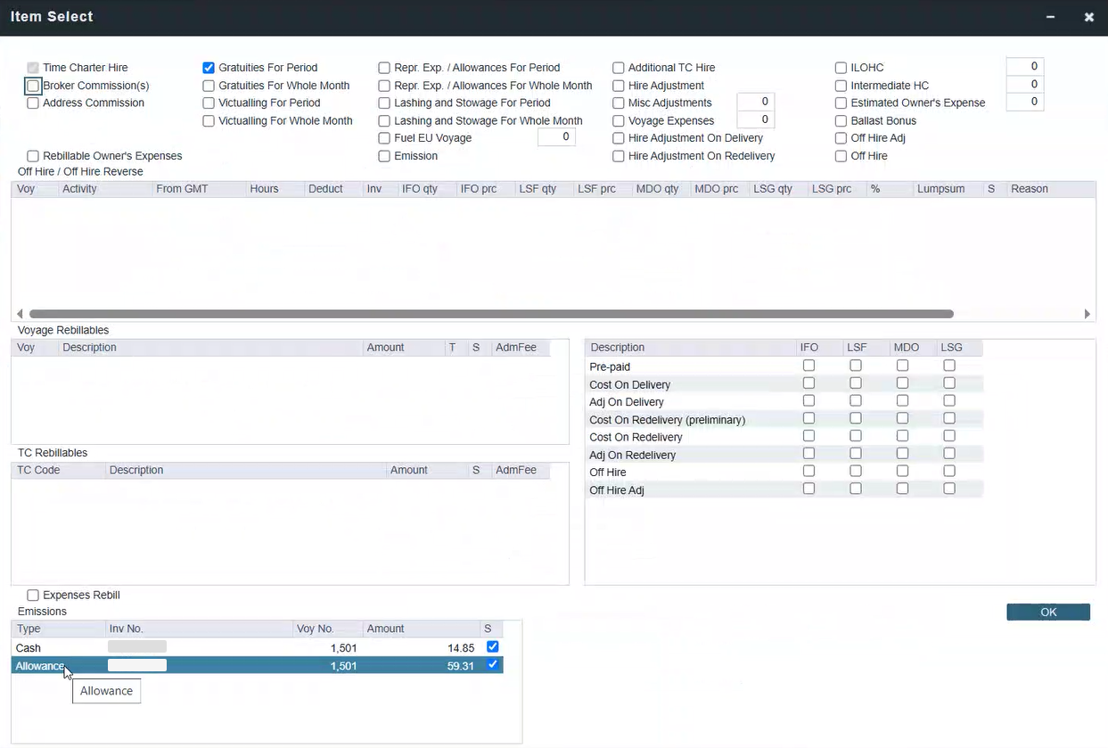 You can include Cash emissions invoices in Time Charter In and Time Charter Out payments once the invoice status is set to Actual as part of the Emissions Expense Settlement Workflow. Incremental payment types are supported with this feature.