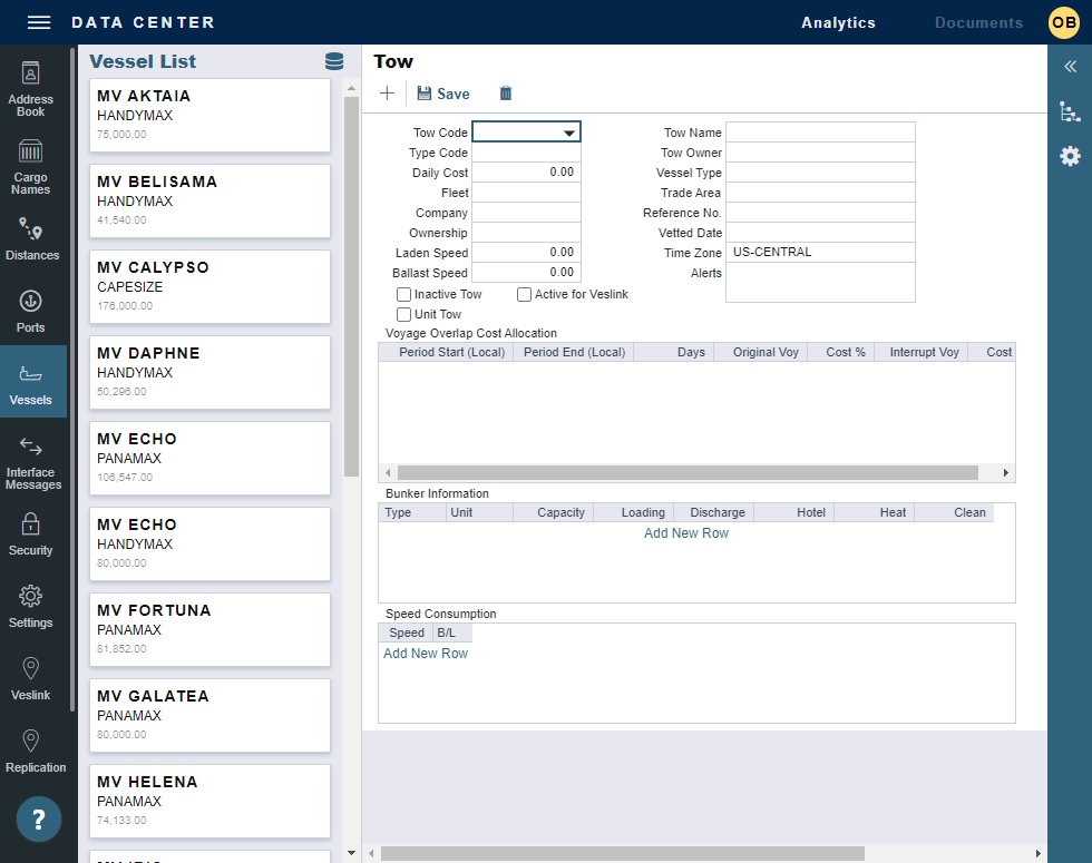To create a Tow, on the Vessel List, click + and then click New Tow.