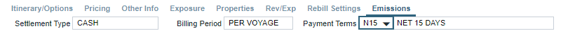 When the Enable Cargo Emissions Allocation flag (CFGEnableCargoEmissionsAllocation) is enabled in an IMOS environment, a new Emissions tab will become visible on the Cargo and VC In contracts. This tab is to be used to capture the contractual details that were agreed to with the counterparty on the contract for how emissions expenses will be settled over the life of the contract. Clicking on this Emissions tab on a Cargo Contract will show the following three fields: