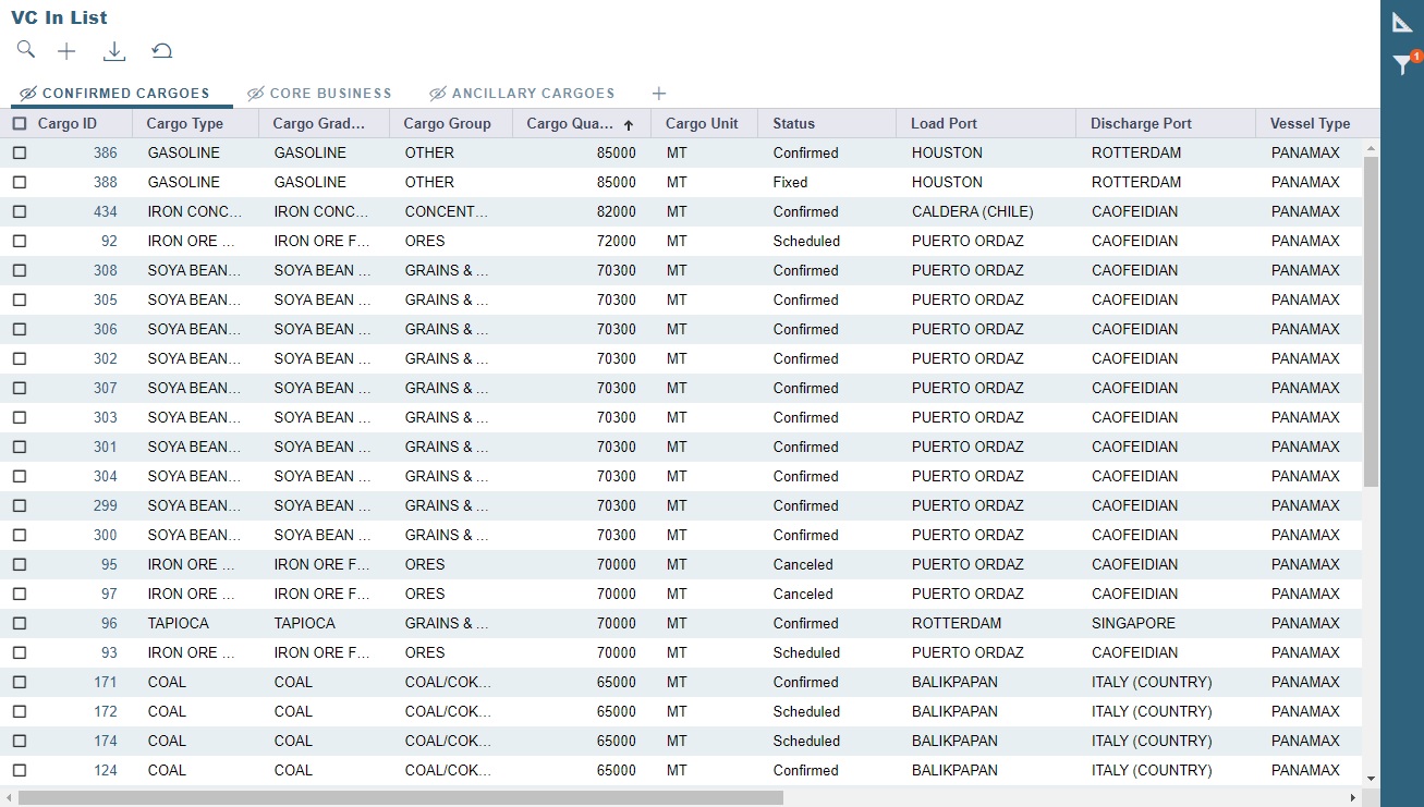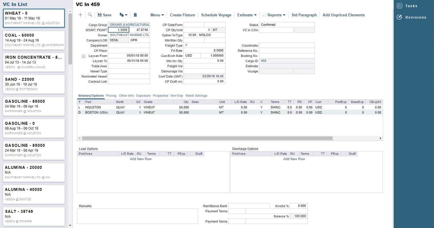 On the Chartering menu, under Cargo, next to VC In, click List.