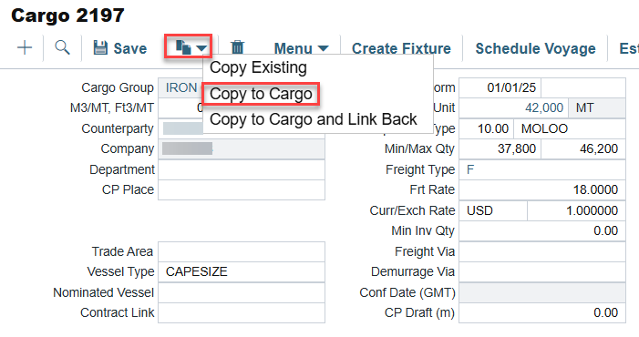 To copy relevant details from a VC In to a Cargo and Link them in a Relet connection (similar to clicking Releton a Cargo), click the copy icon, and then click Copy to Cargo and Link Back. Pricing, demurrage, broker, and Extra Freight Terms details are not copied onto the Cargo.