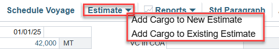 To create an Estimate from a VC In, click Estimate and then click Add Cargo to New Estimate. An Estimate is created with the Cargo. If a vessel has been nominated, the new Estimate uses this vessel.