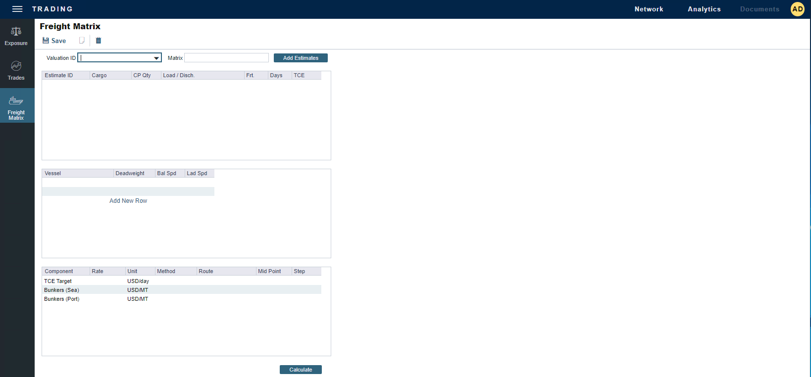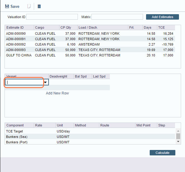 If you want to see how a specific freight rate would be calculated given forward market data and conditions for additional vessels, add them to the Vessel grid and run the calculation again.