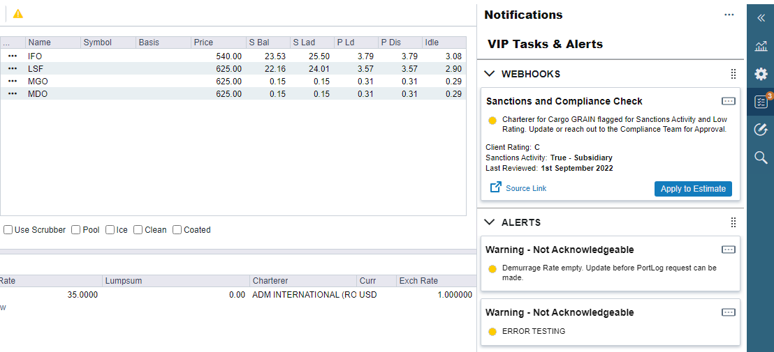 To run your webhook, navigate to Estimates in the Chartering module and open an estimate in details view. Then, expand the Notifications panel. In this panel, you will see the response message that is returned by the webhook.