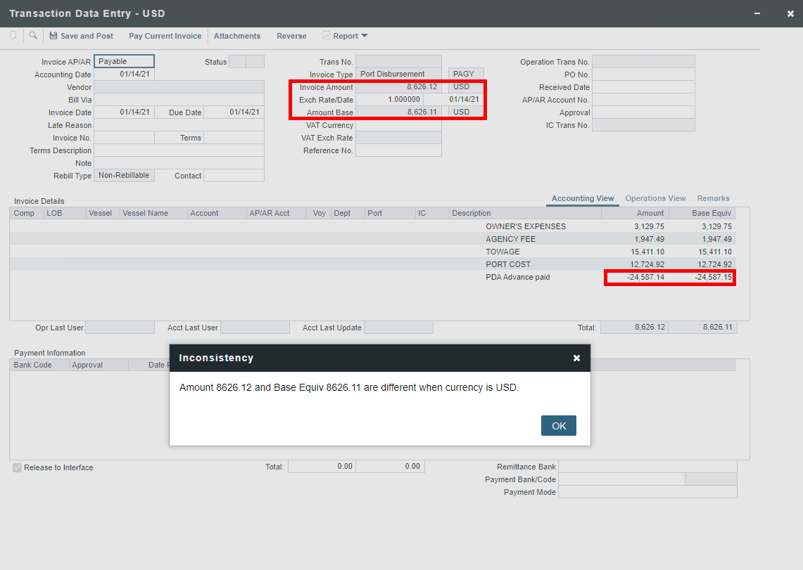 For example, say that a user is creating Port Disbursement invoices, where the PDA’s Invoice Amount is reported in NOK and its Amount Base is reported in USD. If the user creates a FDA invoice where only USD is used for both Invoice Amount and Amount Base currencies, then the user runs the risk of these two fields mismatching after PDA adjustments have been made to the FDA due to VIP’s inherent rounding logic. The system could then present users attempting to post the mismatched invoice with the following error message, preventing Saving and Posting: