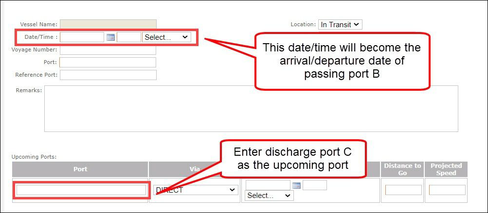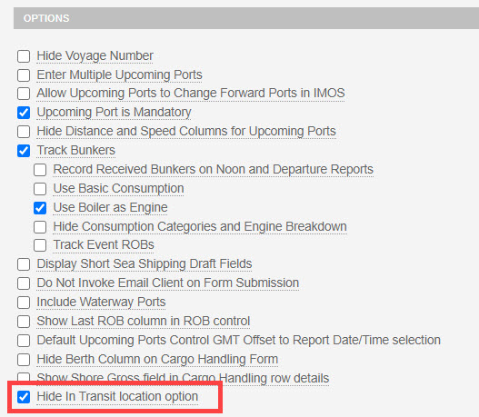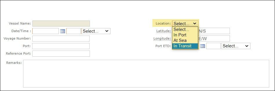 The Master sends out a Noon Report every day and there is an “In Transit” option in the Veson IMOS Platform Noon Report form, as shown hereunder: