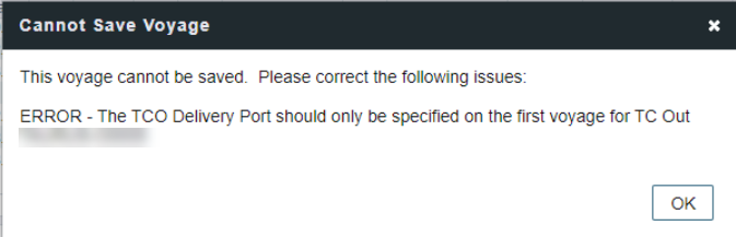 This error can occur if the voyage’s TCO code is mistakenly entered in another voyage. You must check other voyages for the same TCO code, once identifying the error enter the correct TCO code. You will then no longer receive the above error for the current voyage.