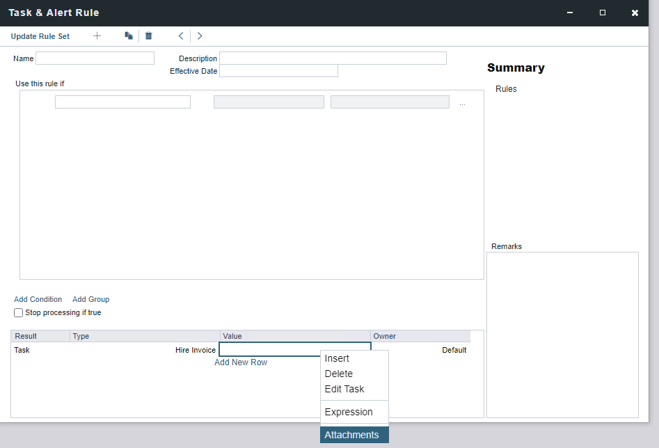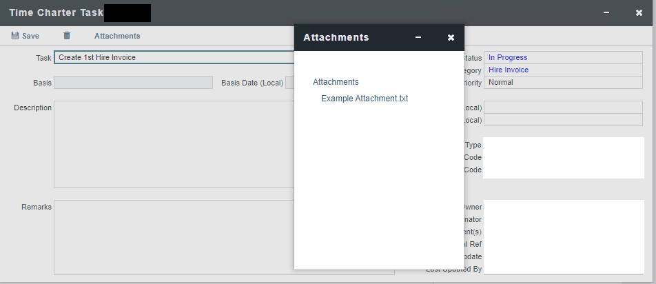 To add Attachments, right-click the Task result at the bottom of the Task & Alert Rule Form, select ‘Attachments’. Right click the ‘Attachments’ hyperlink on this window to add an Attachment. The Attachment will then be available as read-only, under the Attachments on the Time Charter Task, each time the Task is generated.