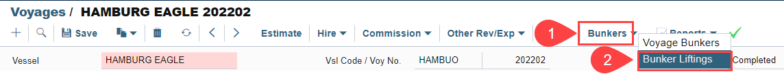 To find this list, you can go to the Voyage Manager, then go to "Bunker Liftings“ (Bunkers > Bunker Liftings).