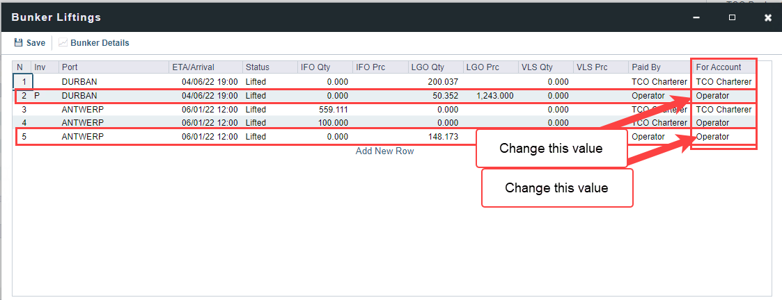 Navigate again to voyage Bunker Liftings screen within Voyage Manager and change back the For Account field to "Operator“ → Save → Save voyage.