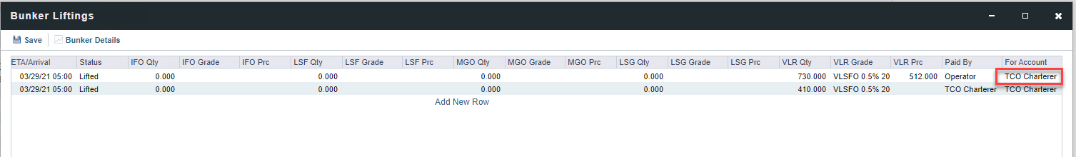 Navigate to the specific voyage and from the top menu select Voyage Bunkers → Bunker Liftings; change the For Account field from "Operator“ to "TCO Charterer“ → Save → Save the voyage and refresh.