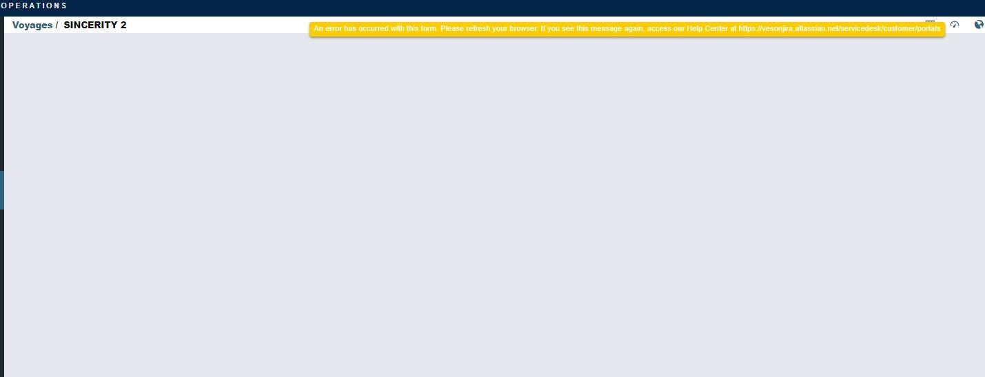 When utilizing the Voyage Manager tool, if a user creates a voyage with missing data or unpopulated fields and a red or yellow icon appears, this represents an Error or Warning, which the user must correct. If the user makes the corrections and attempts to save, but the user is brought to and stuck on the screen below, they must perform the following steps in order to proceed: