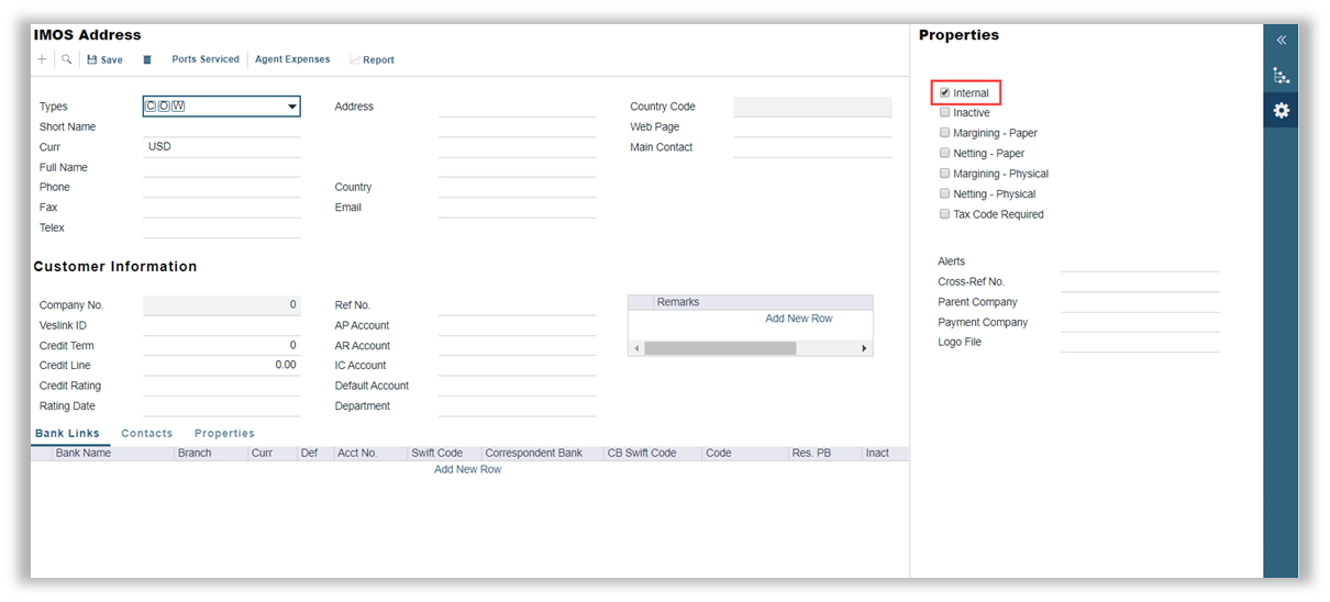 When creating an invoice from a mirrored contract, if you notice that its mirrored invoice is not automatically created, check that the Internal check box is selected on the Address Properties panel of the respective W-type companies involved in these mirrored contracts: