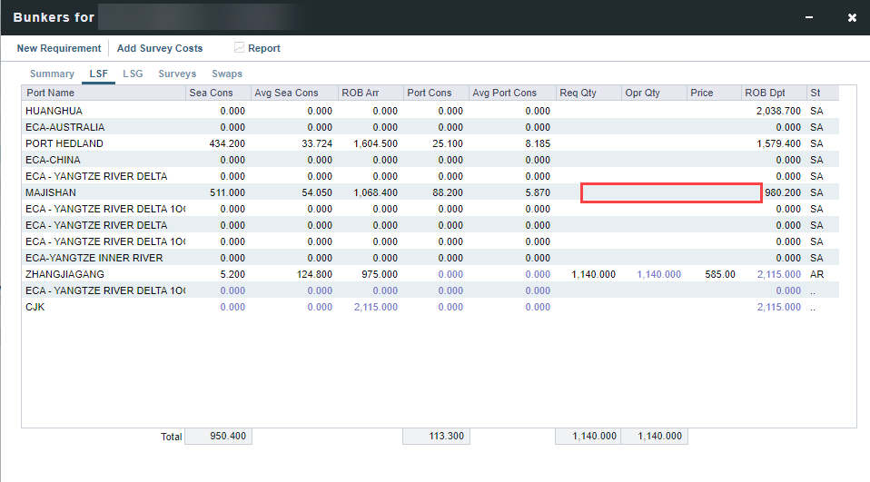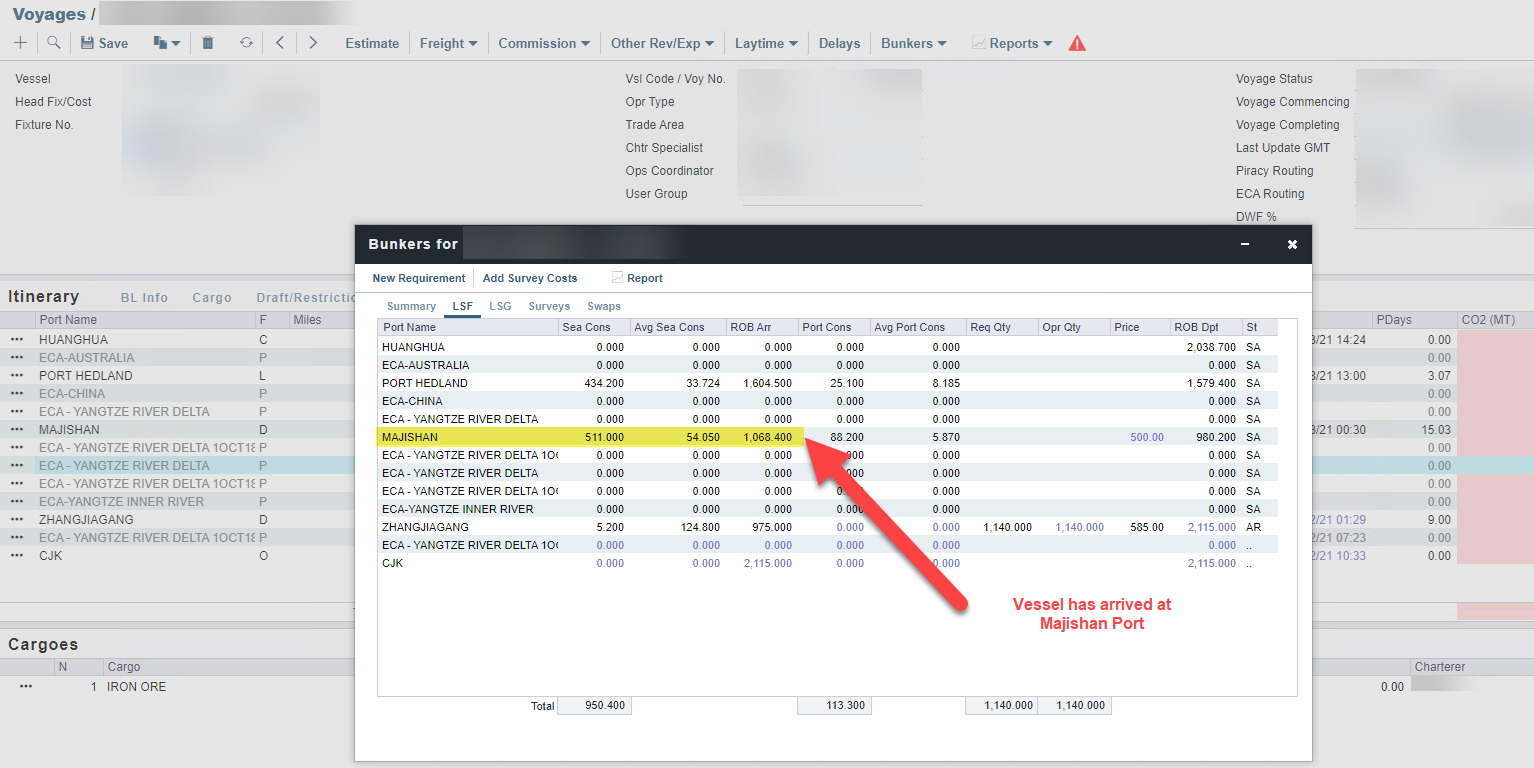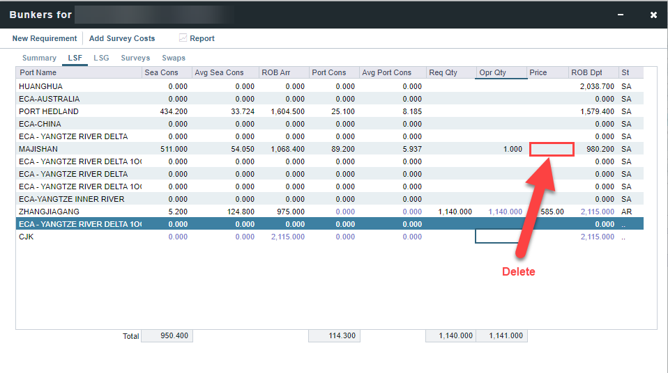 If a bunker requirement is deleted after the vessel has arrived at the bunkering port, its bunker price will remain under the relevant bunker type(s) in the Voyage Bunkers form. This is because the system is already expecting the planned bunkers to be lifted during this port stay.