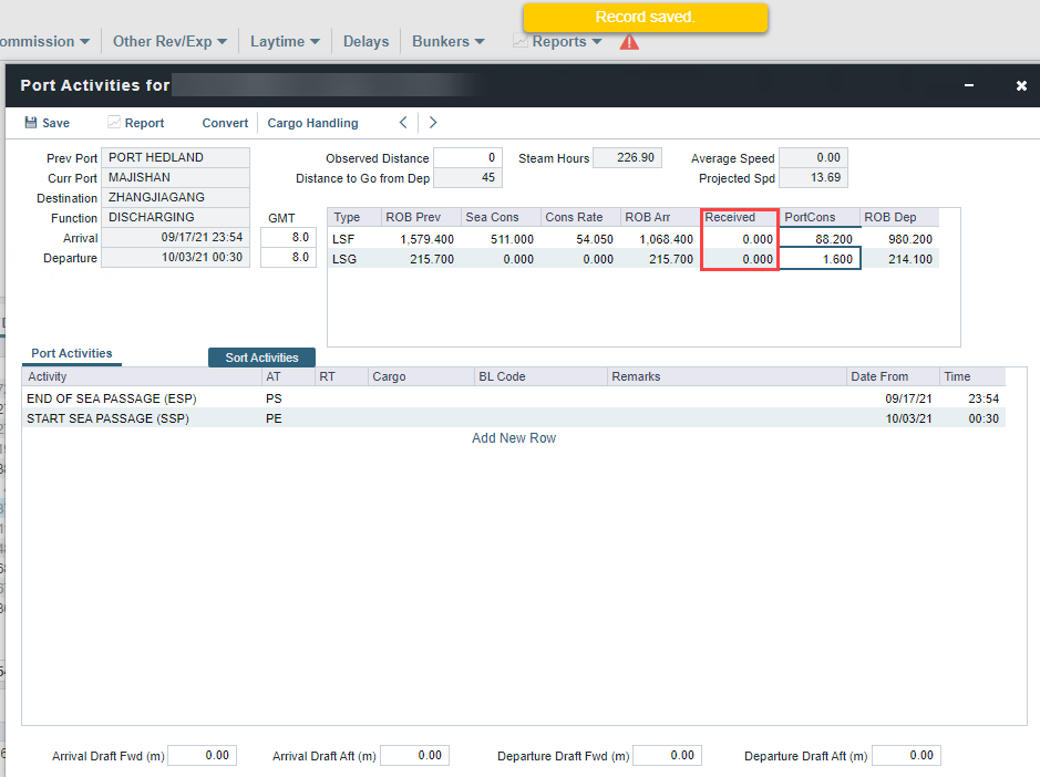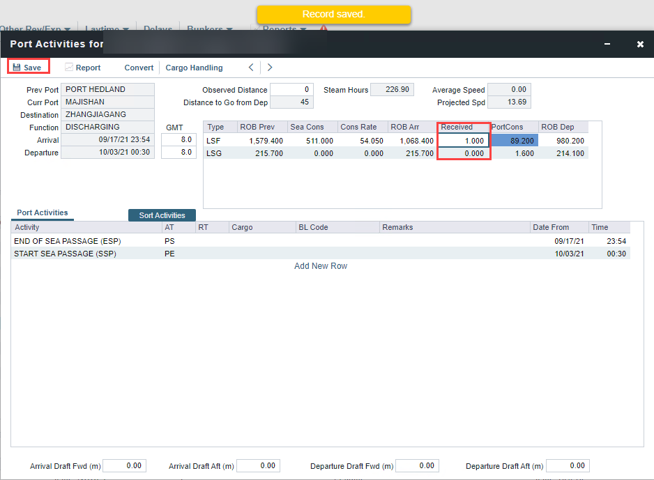 Finally, go back to the Port Activities form of the bunkering port and delete the 1 MT entered previously. Save the Port Activities and the voyage.