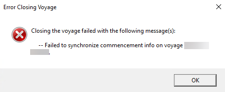 The common result of the error is overlapping commencement and completion times between consecutive voyages. Changing these times and saving will resolve the error and allow the closing of the voyage.