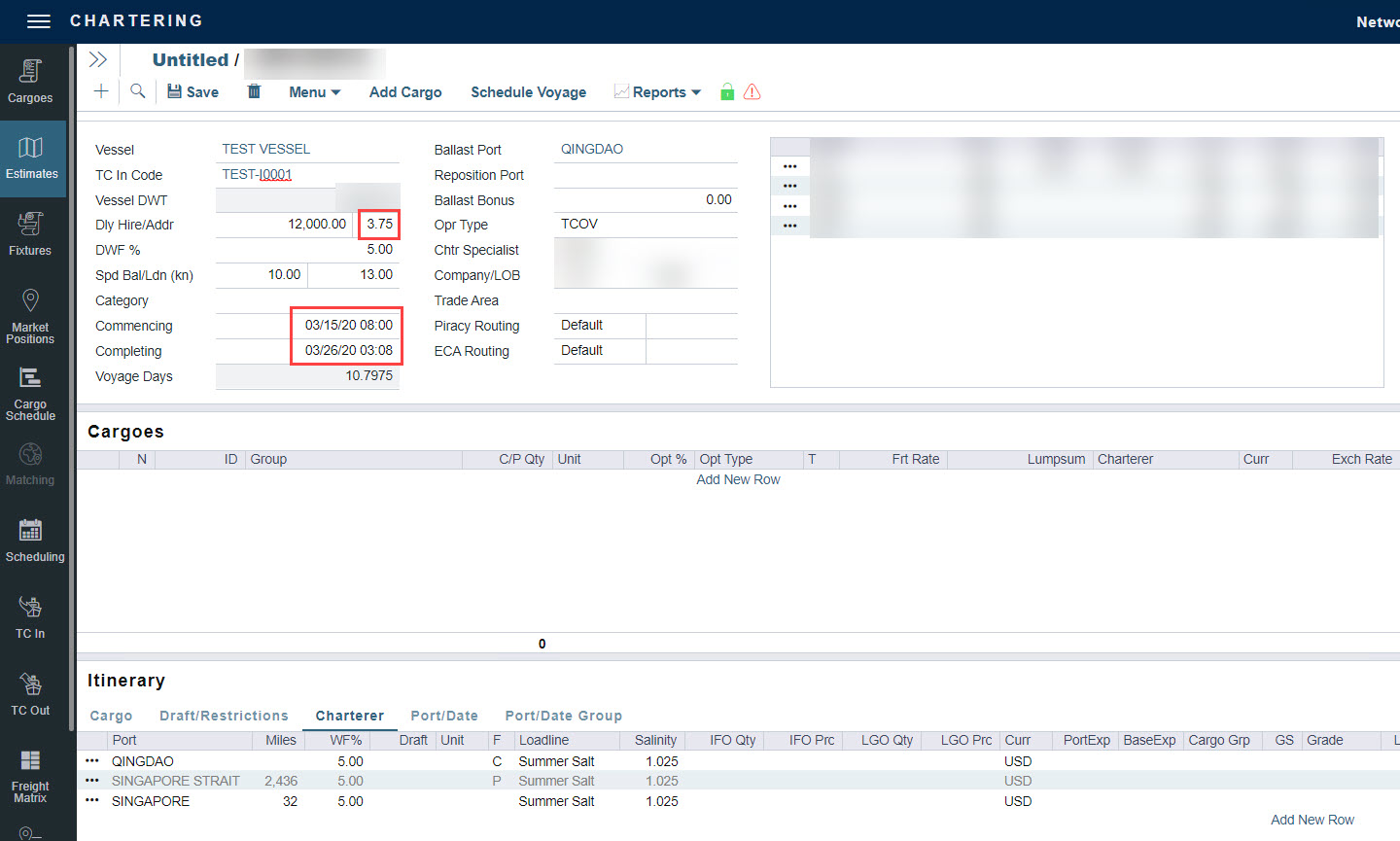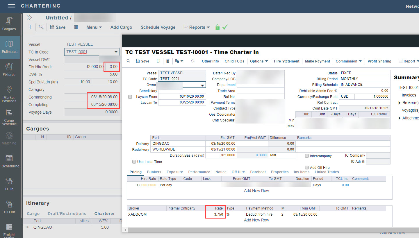 If you have selected a Time Charter (TC) In for your Estimate and notice that the address commission rate specified in the TC In did not flow into the Estimate, make sure the voyage duration of your Estimate is greater than zero.