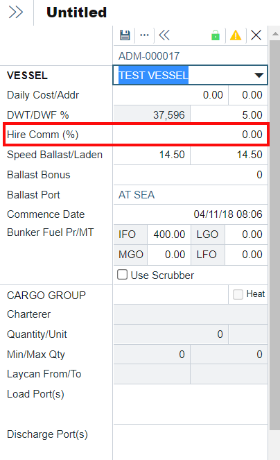 Once the flag is enabled, a new field Hire Comm (%) will be available in the voyage estimate, where you can indicate the appropriate broker commission percentage to be included in the Voyage Estimate P&L.