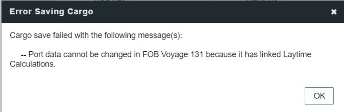 If when trying to save, the error "Port Data cannot be changed in FOB Voyage # because it has linked Laytime Calculations“ appears,