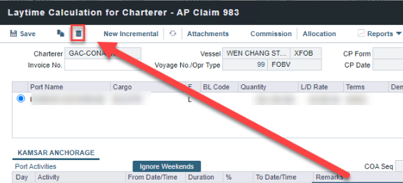 Select the Delete icon, and repeat this process for each attached Laytime Calculation: