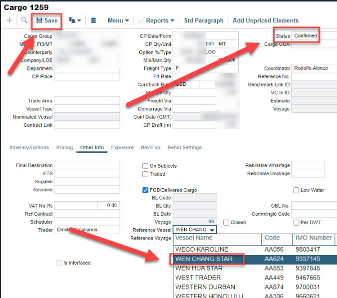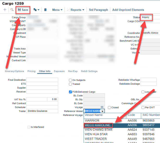 For "An error occurred while saving FOB Voyage #“, which will often occur after deleting the linked laytime calculations, you must change the Status to inquiry and change the reference vessel to any vessel in the list, then press "Save“:
