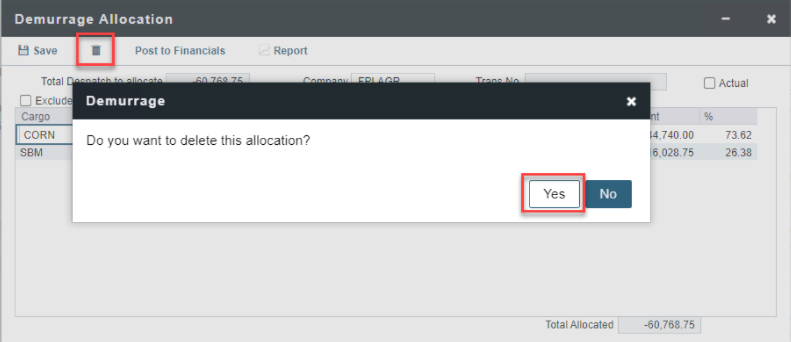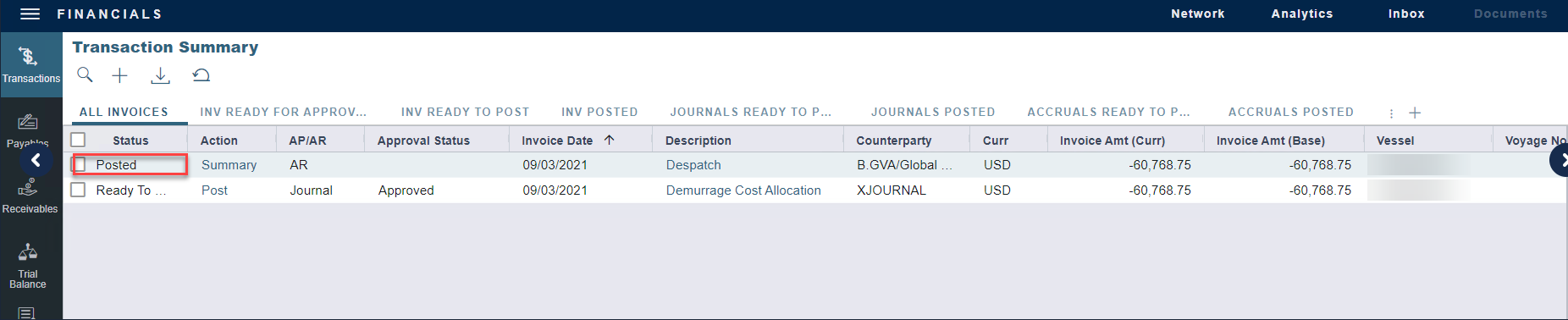 However, if demurrage is allocated to other counterparties in the Demurrage Allocation Summary, the despatch/demurrage invoice status in the Transaction Summary will automatically be reflected as Posted even though the invoice is not yet posted.
