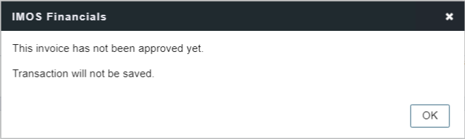 Screenshot of an error pop-up window "The invoice has not been approved yet. Transaction will not be saved." when attempting to post the despatch invoice