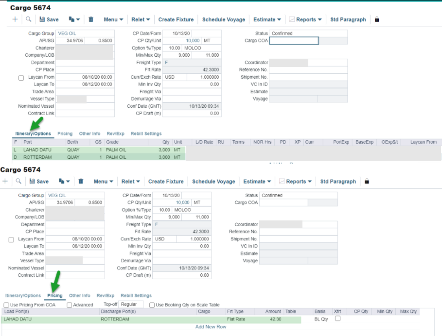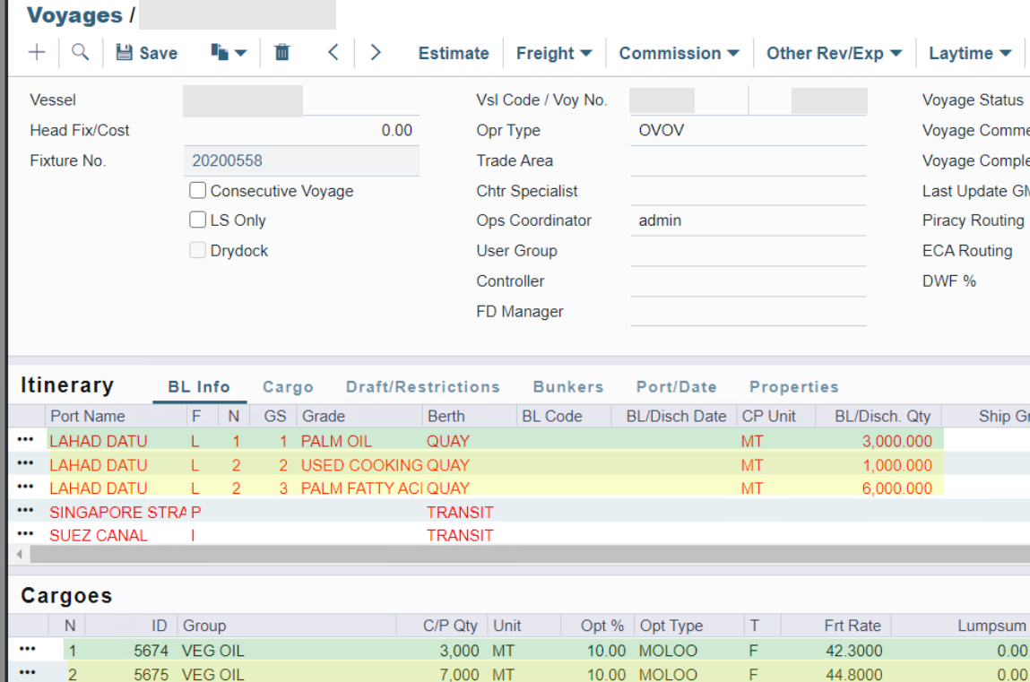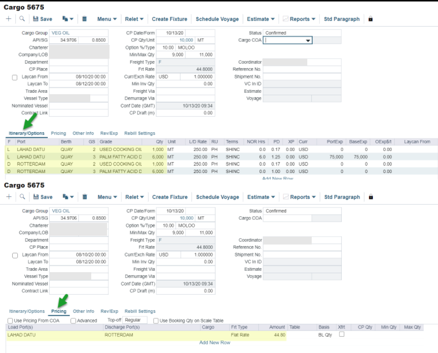 Scenario: User has created a cargo contract which includes different cargo grades with different pricing (freight rates), belonging to the same counterparty. In addition, all the cargo grades are being loaded and discharged in the same ports.