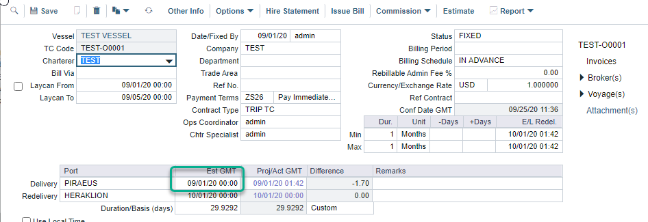 Before we dive into the steps taken for the first hire invoice under this condition, let’s observe the fields "Est GMT“ (estimated time of delivery )and "Proj/Act GMT“ (projected/actual time of delivery). The field "Est GMT“ is manually filled in by the creator of the TC contract, whereas the field "Proj/Act GMT“ is automatically populated by the latest voyage existing in the Veson IMOS Platform. For example, if the itinerary of the latest current voyage in the Veson IMOS Platform gives an estimated time of voyage completion "09/01/20 01.42“, then this date will be auto-populated in "Proj/Act GMT“ in blue fonts, which indicates that this date is projected time of delivery. When the new voyage under the TC contract you have created "commences" (Status: Commenced), then the filed "Proj/Act GMT“ will be automatically updated in black fonts, which means that the delivery date is now actual. If there is no previous voyage in the system, then Est GMT with coincide with Proj/Act GMT.