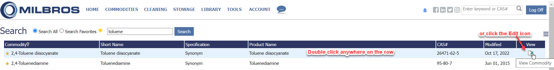 The Commodity Detail section can be accessed by clicking the “Edit” icon in the right column for any record in the Commodity Search Module or you can double-click anywhere on the row.