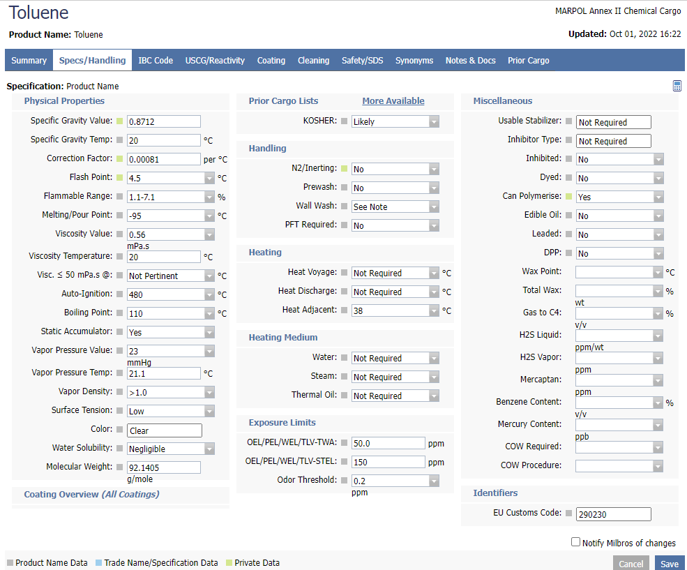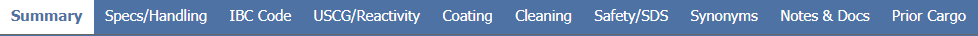 USCG/Reactivity | The ‘USCG/Reactivity’ tab contains information regarding the commodity’s USCG Compatibility Group number, compatible and incompatible exceptions to the USCG Group and Reactivity Properties. You also have the ability to lookup another commodity to see if it is compatible with the currently selected commodity. The tab also contains notes regarding USCG/Reactivity for the commodity. See Section 2.5.4 for further information. |