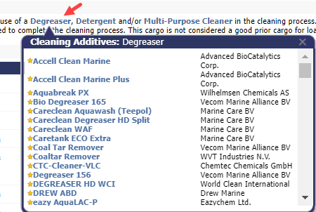If the cleaning method states the types of cleaners to be used then these cleaner types can be clicked to view a list of the available IMO evaluated cleaning chemicals that can be used.
