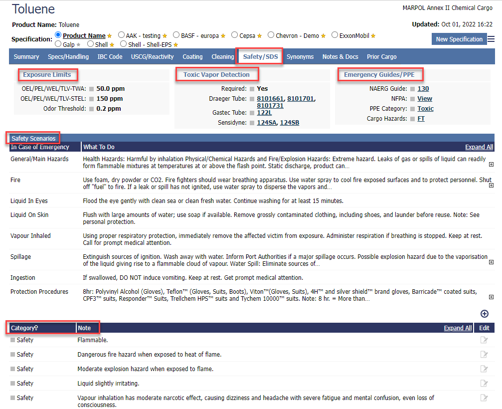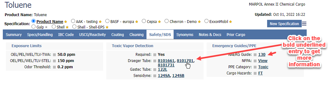 Safety/MSDS | The ‘Safety/MSDS’ tab contains information on Exposure Limits, Toxic Vapour |