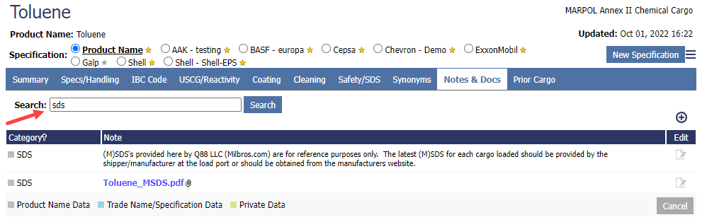 Private Data entered a the Product Name or Trade Name level will also display under any specifications under that Product Name or Trade Name. Any data entered at the Specification level will only display for that specification.