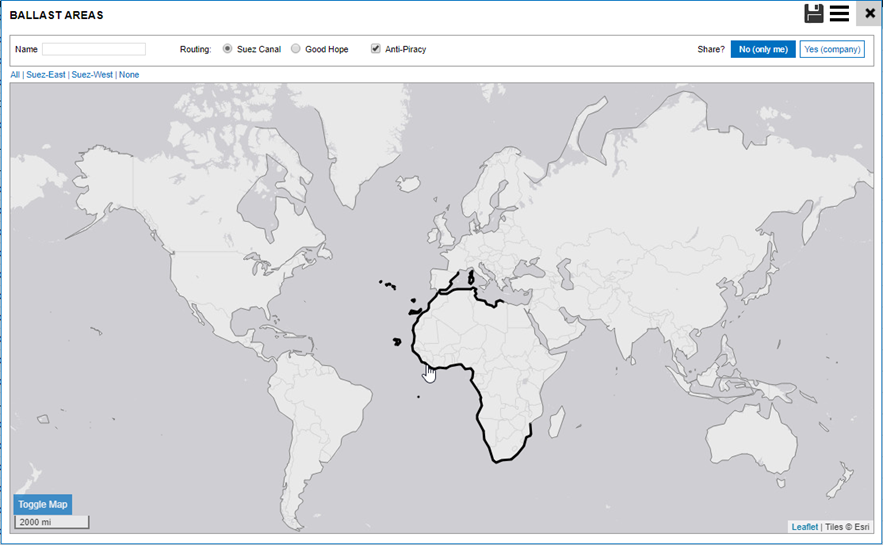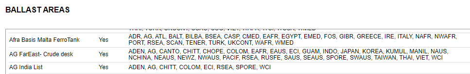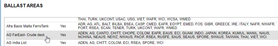 The system gives you the ability to create your own ballast areas. You can use the Ballast dropdown list in the Search Criteria to specify which areas to have ships ballast from for the entered Load port or area.